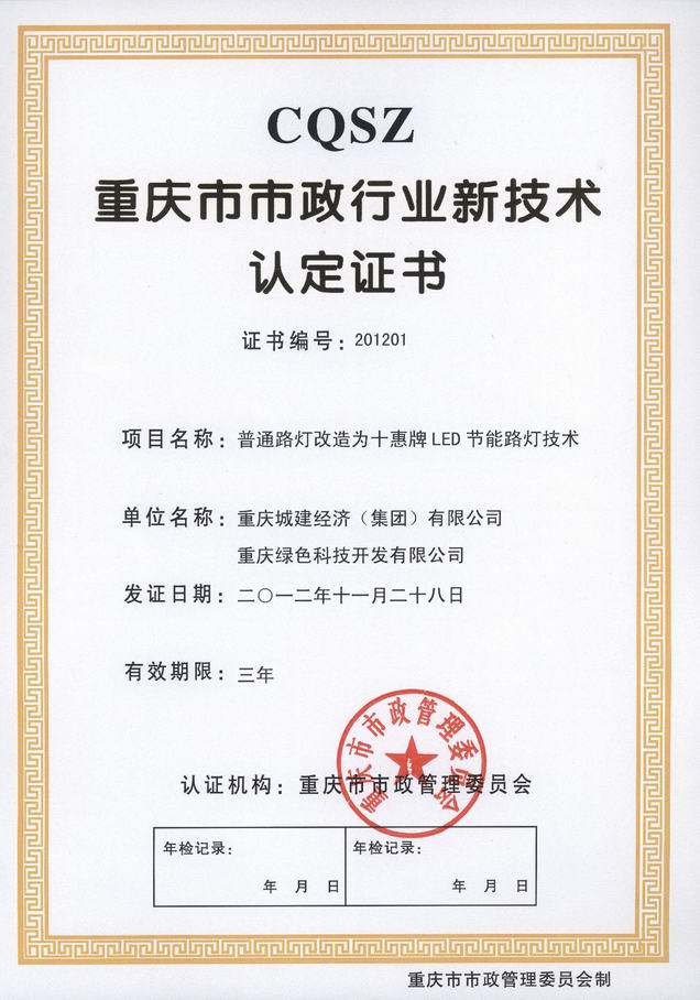 《市政行業(yè)新技術(shù)認證證書》(“十惠牌”背街小巷一體化拆裝方便的LED專用節(jié)能路燈燈泡)